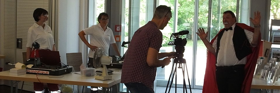 Calw-Hirsau. Manch ein Blutspender hielt vergangene Woche im Kursaal von Hirsau erst einmal inne. Doch der leibhaftige „Dracula“ war es nicht, der ihnen an ihren Lebenssaft wollte. Gleichwohl rührte er die Werbetrommel für eine Blutspende, was in dieser Weise in einen Imagefilm einfließen wird.