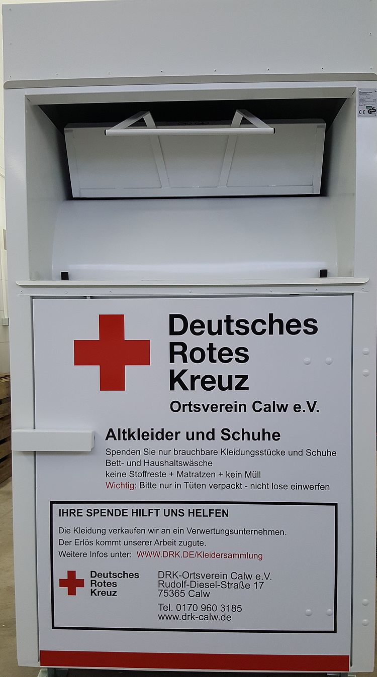 Matratzen und Möbel können wir leider nicht annehmen. Bei Reklamationen oder versehentlichem Einwurf von Kleidung können sie den DRK Ortsverein Calw für die Standorte Calw und Hirsau unter der Telefonnummer 0170 / 9603185 erreichen.Bitte kein Müll einwerfen oder neben dem Container ablegen, dieser muß von uns kostenpflichtig entsorgt werden!!!